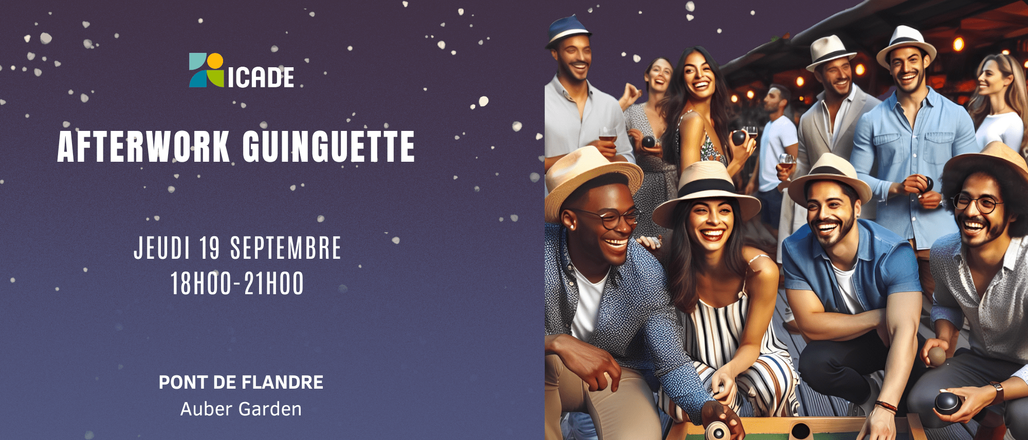 Suite au succès de l’afterwork de juin dans le lieu atypique et verdoyant, Auber Garden, situé à seulement 10 minutes en voiture ou en transport du site du Pont de Flandre, nous avons le plaisir de vous inviter à un afterwork festif dans une ambiance "Guinguette”.
